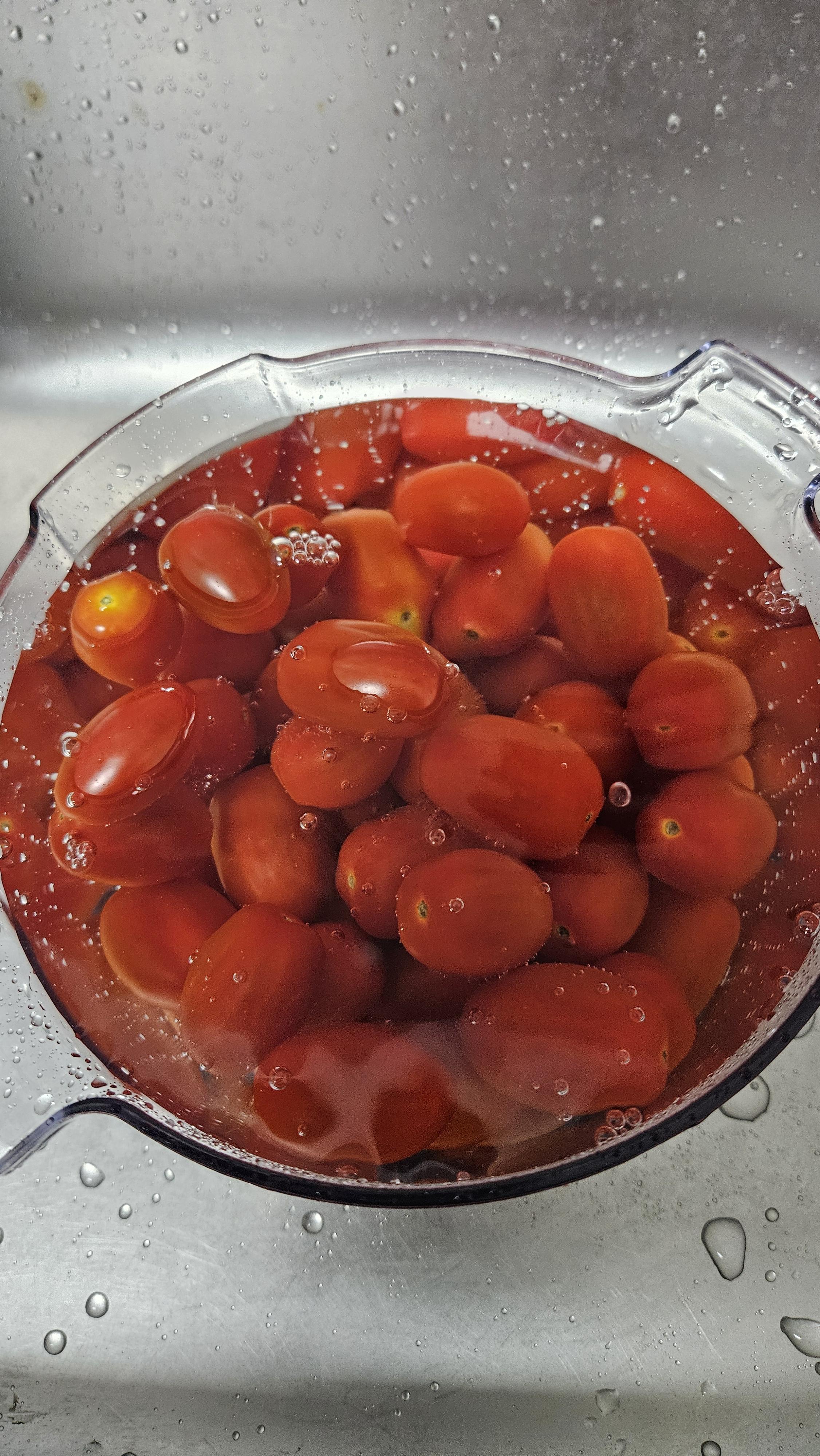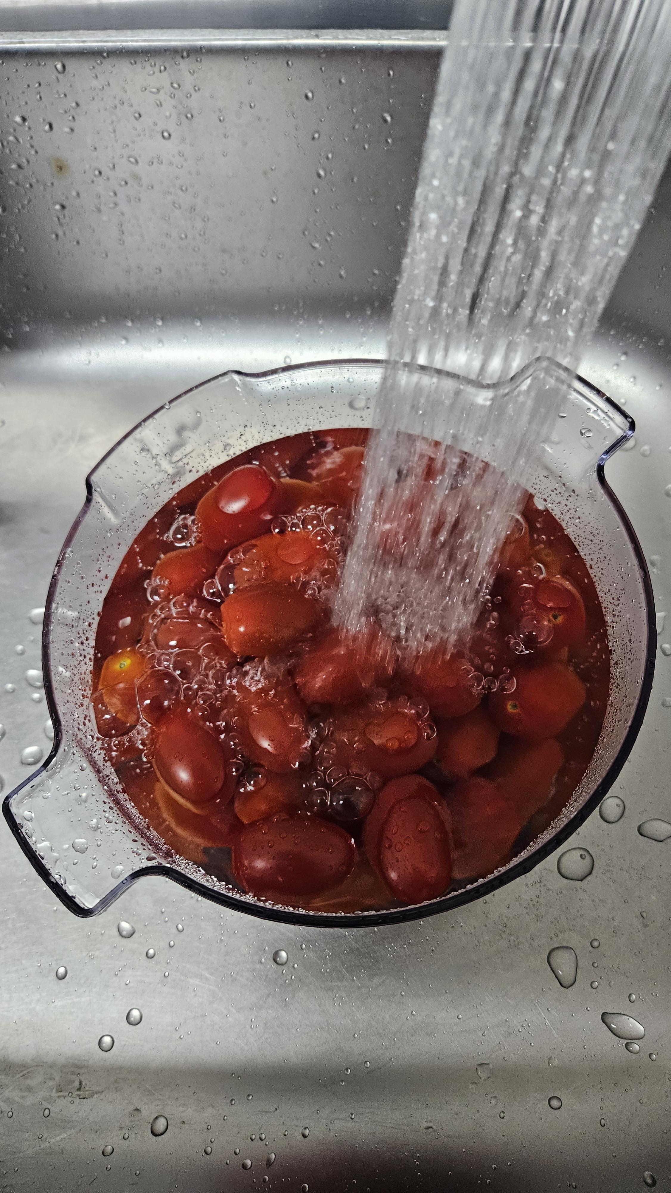 토마토를 흐르는 물에 헹굽니다. 이 때, 물의 온도는 미지근한 것이 좋습니다.