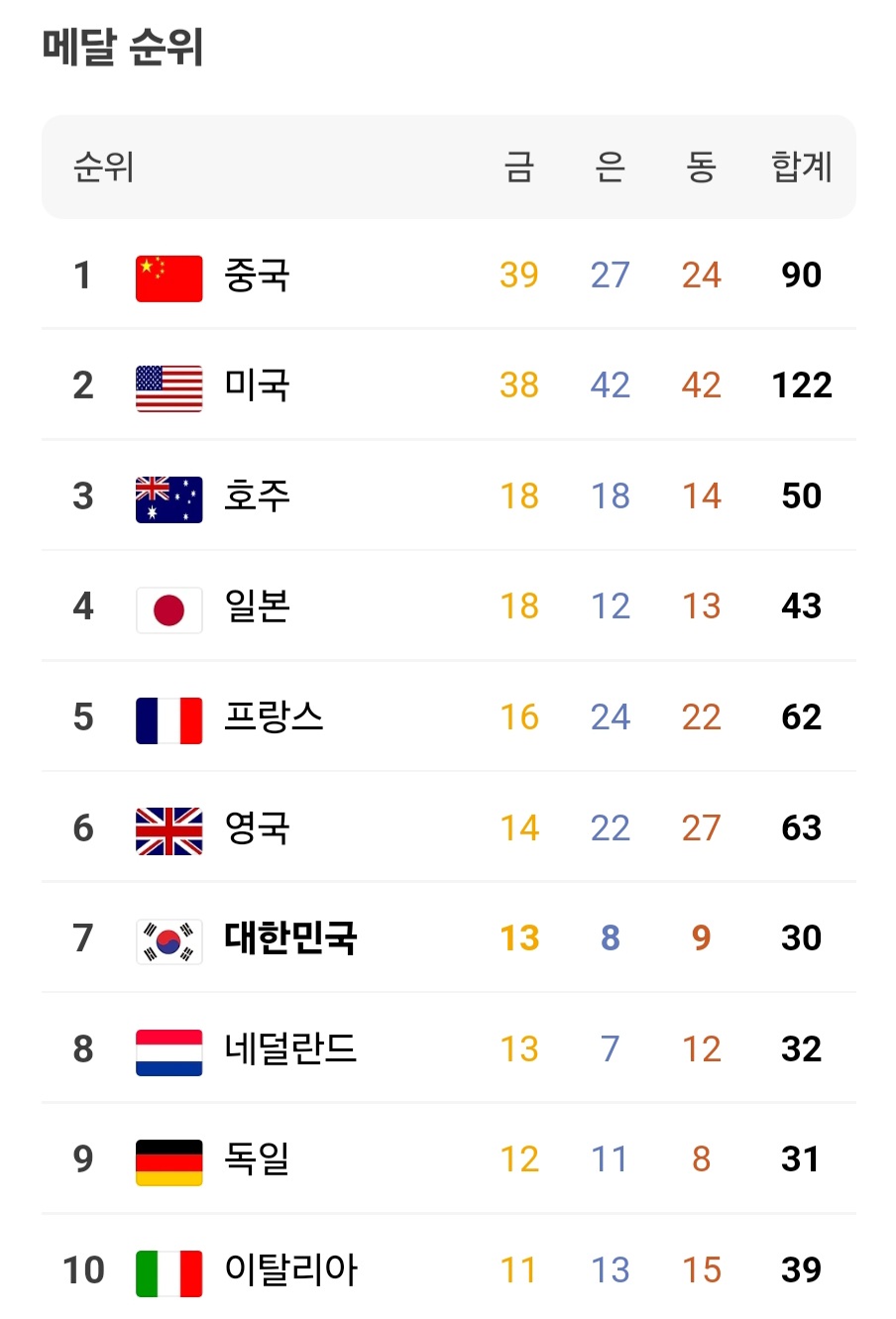 2024 파리 올림픽 대한민국 매달 순위 (8/11 기준)