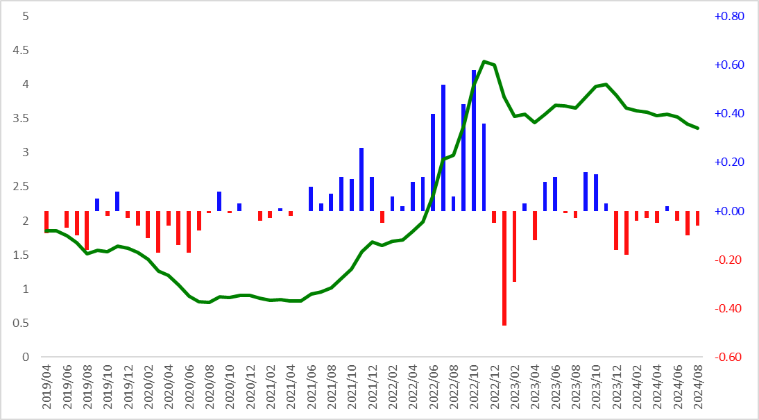 기준금리 : 3.36% (8월 3.42% - 7월 3.52% - 6월 3.56%)